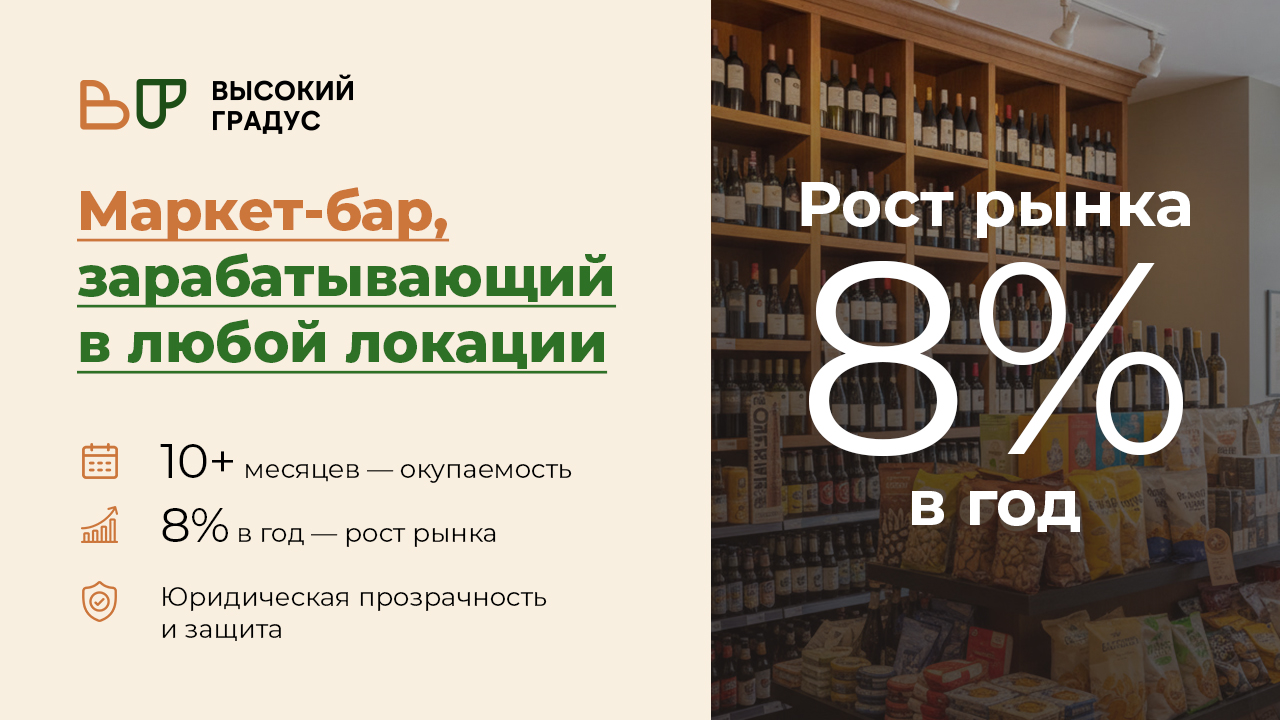 Высокий ГрадусСтоимость990 000 ₽Инвестиции1 396 000 ₽Окупаемость10 мес.Доход300 000 ₽Высокий Градус — франшиза круглосуточного маркет-бара у дома. Мультиформат: крепкий алкоголь, разливное пиво, пицца, суши, бургеры, табак и электронные сигареты. Доход от 300 000 рублей в месяц, окупаемость 10 месяцев. Готовая бизнес-модель с узнаваемым брендом, маркетингом, проверенными поставщиками и договорными гарантиями. Работаем с партнёрами на всех этапах запуска и развития бизнеса. Закрывайте потребности клиентов 24/7 и формируйте стабильный поток прибыли сразу по нескольким направлениям!