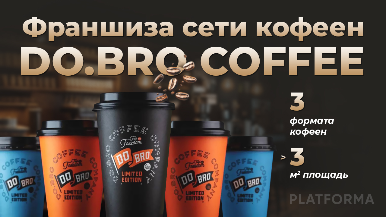 DO.BRO COFFEEСтоимость590 000 ₽Инвестиции2 300 000 ₽Окупаемость14 мес.Доход300 000 ₽DO.BRO COFFEE — франшиза сети кофеен, которые известны в России с 2005 года. Открыв кофейню, вы сможете зарабатывать от 300 000 рублей ежемесячно, используя зерна из 15 регионов. Франшиза подойдет, если даже у вас нет опыта в предпринимательстве — мы предоставляем поддержку на всех этапах проекта, проводим постоянное обучение сотрудников, готовим к открытию полноценную маркетинговую кампанию. Кофейная культура процветает, и наша культурная атмосфера гарантирует успех при полной поддержке.DO.BRO Coffee — франшиза для тех, кто хочет зарабатывать на кофе. Здесь не нужно изобретать формат и учиться на своих ошибках. Вы получаете проверенную модель кофейни с собственным производством кофе и сильным брендом. Запуск возможен без опыта и в любом городе. Потенциальный доход — от 300 000 рублей в месяц. Всё готово под ключ: обучение, поставки, маркетинг и сопровождение. Запросите презентацию франшизы и посмотрите, как DO.BRO Coffee может работать в вашем городе!