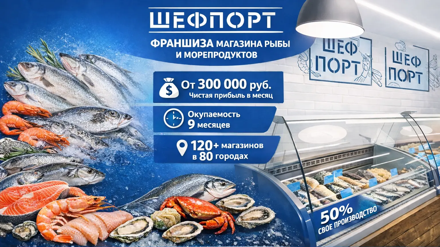 ШефПортСтоимость590 000 ₽Инвестиции900 000 ₽Окупаемость9 мес.Доход300 000 ₽Франшиза премиального магазина рыбы и морепродуктов. Вы входите в растущий рынок (+12% в год) с готовой и управляемой моделью. Партнёры зарабатывают от 300 000 рублей чистой прибыли в месяц при марже до 35%. С 2021 года уже открыто 120+ магазинов в 80 городах России! 50% ассортимента — эксклюзив собственного производства, доступный только франчайзи. Мы обеспечим вас поставками, обучением и юрподдержкой. Получите презентацию со всеми расчётами и постройте свой доходный бизнес с качественным продуктом и опытной командой.