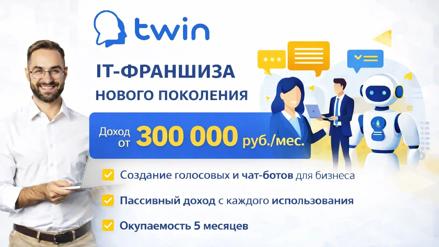 TwinСтоимость450 000 ₽Инвестиции90 000 ₽Окупаемость5 мес.Доход300 000 ₽IT-франшиза нового поколения с доходностью от 300 000 рублей позволит вам зарабатывать на разработке голосовых и чат-ботов для бизнеса, а также получать доход с каждого использования бота. Франшиза позволяет открыть бизнес даже людям, не имеющим опыта в IT-сфере. Рентабельность бизнеса достигает более 22,7% по чистой прибыли.