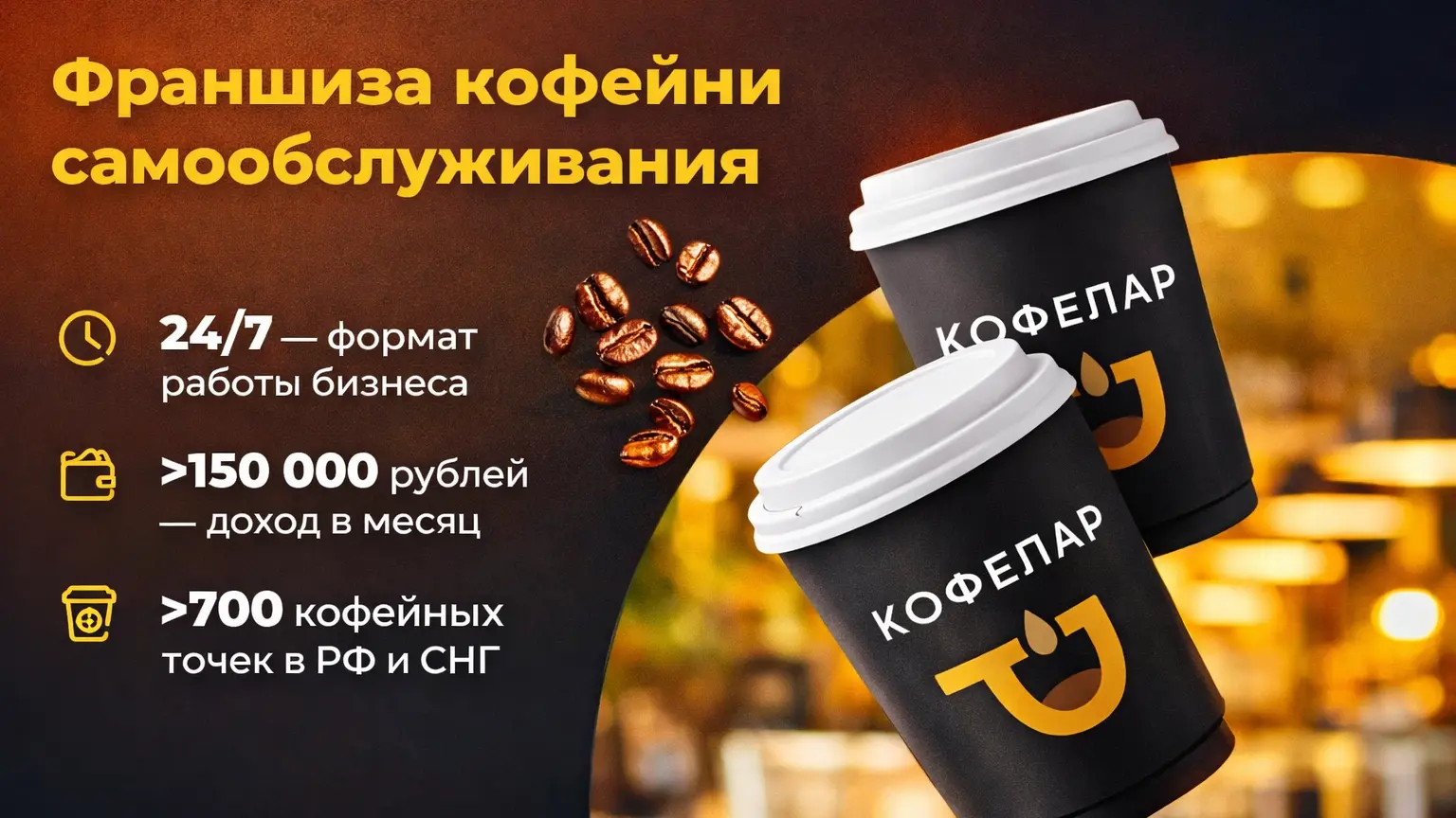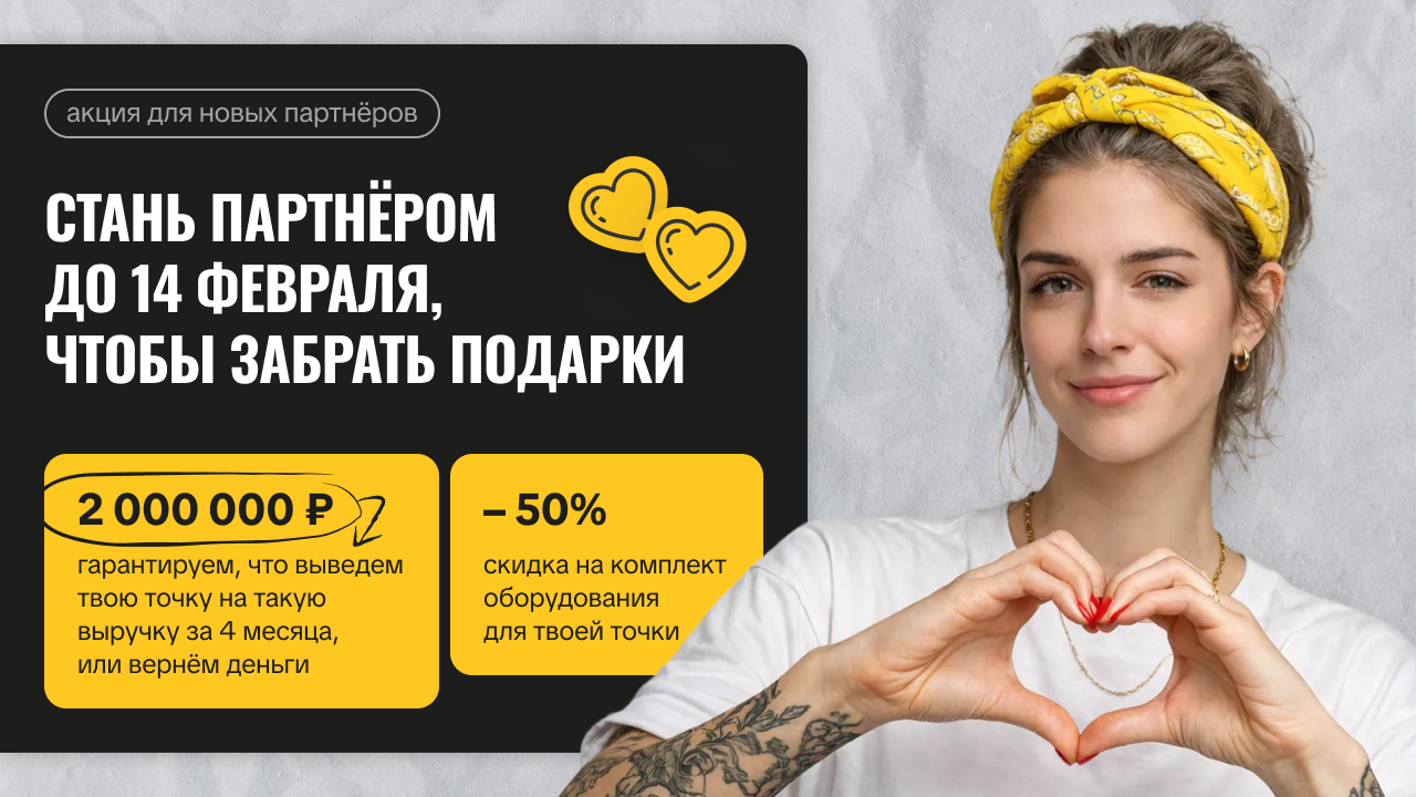 КофеларСтоимость550 000 ₽Инвестиции250 000 ₽Окупаемость8 мес.Доход150 000 ₽Открыв кофейню самообслуживания, зарабатывайте до 150 000 рублей ежемесячно, тратя всего 4 часа в неделю. Чек-листы локаций, обучение и поддержка 24/7 упрощают старт. Уже более 700 точек успешно работают и приносят прибыль своим владельцам. К 2028 году популярность кофе навынос вырастет на 10% ежегодно. Эта модель обеспечивает пассивный доход в востребованной нише.