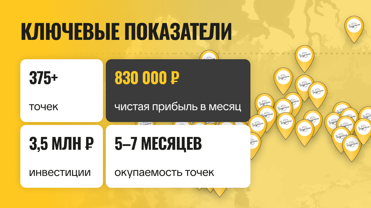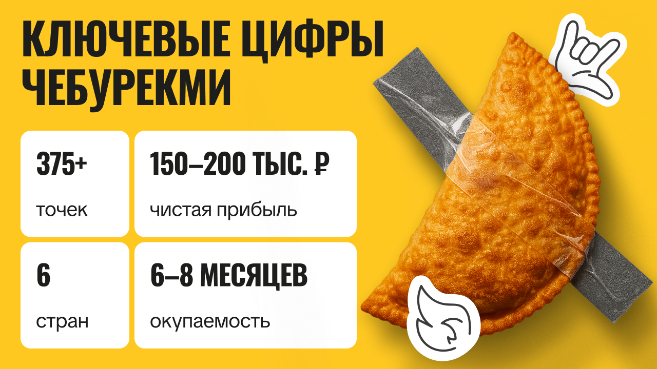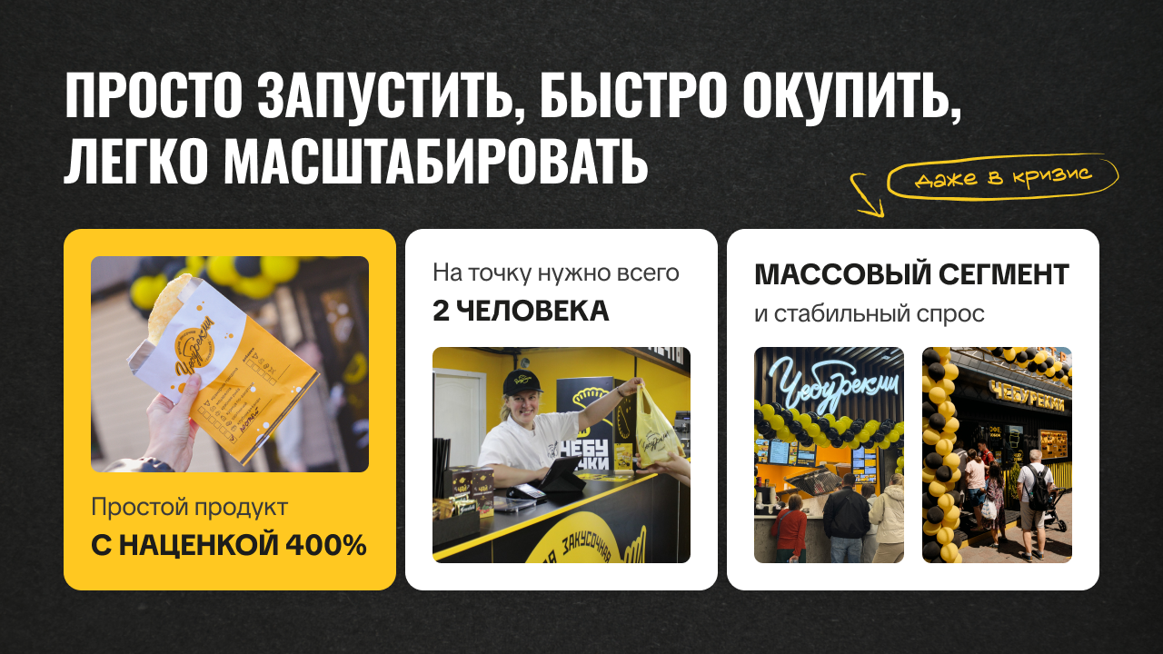 ЧебурекМиСтоимость500 000 ₽Инвестиции700 000 ₽Окупаемость6 мес.Доход700 000 ₽370+ точек ЧебурекМи в 6 странах — стрит-фуд франшиза, где 40% партнёров масштабируются и открывают 2–14 точек. Ежемесячный доход достигает 700 000 рублей в месяц даже с 1 точки. Бизнес-модель работает в городах от 2 500 человек — заходит там, где другие франшизы не окупаются. Формат с постоянным спросом: быстрый чек, понятный продукт, регулярные покупки. Успейте зайти в растущий рынок с уникальным продуктом! Оставляй заявку👇