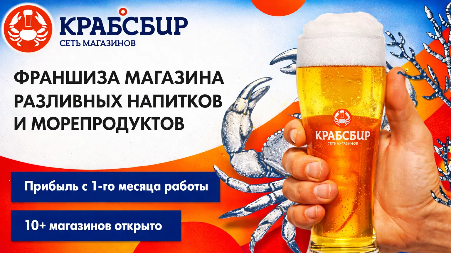 КРАБСБИРСтоимость590 000 ₽Инвестиции2 000 000 ₽Окупаемость6 мес.Доход440 000 ₽Магазины крафтового пива и морепродуктов открыты по всей России, мы предлагаем вам начать свой бизнес с нами и зарабатывать от 440 000 рублей в месяц. Мы поможем вам запустить бизнес за 52 дня. От нас вы получите полный пакет поддержки - помощь с поиском локации, дизайн, контакты поставщиков, маркетинг, обучение, CRM-систему и пошаговые инструкции. Рынок ценителей качественных продуктов и напитков постоянно растёт, и вы можете стать частью этого роста.Франшиза КРАБСБИР — это прибыльный магазин разливных напитков и морепродуктов с доходом от 440 000 рублей в месяц. Готовый формат с высокой маржой и запуском всего за 52 дня. Пиво, крафт, раки, рыба, снеки — продукт ежедневного спроса и стабильных продаж. Бизнес под ключ: проверенные поставщики, обучение, маркетинг, сопровождение на всех этапах. Понятная финансовая модель и окупаемость от 6 месяцев. Заберите прибыльный формат — пока ваш город свободен!