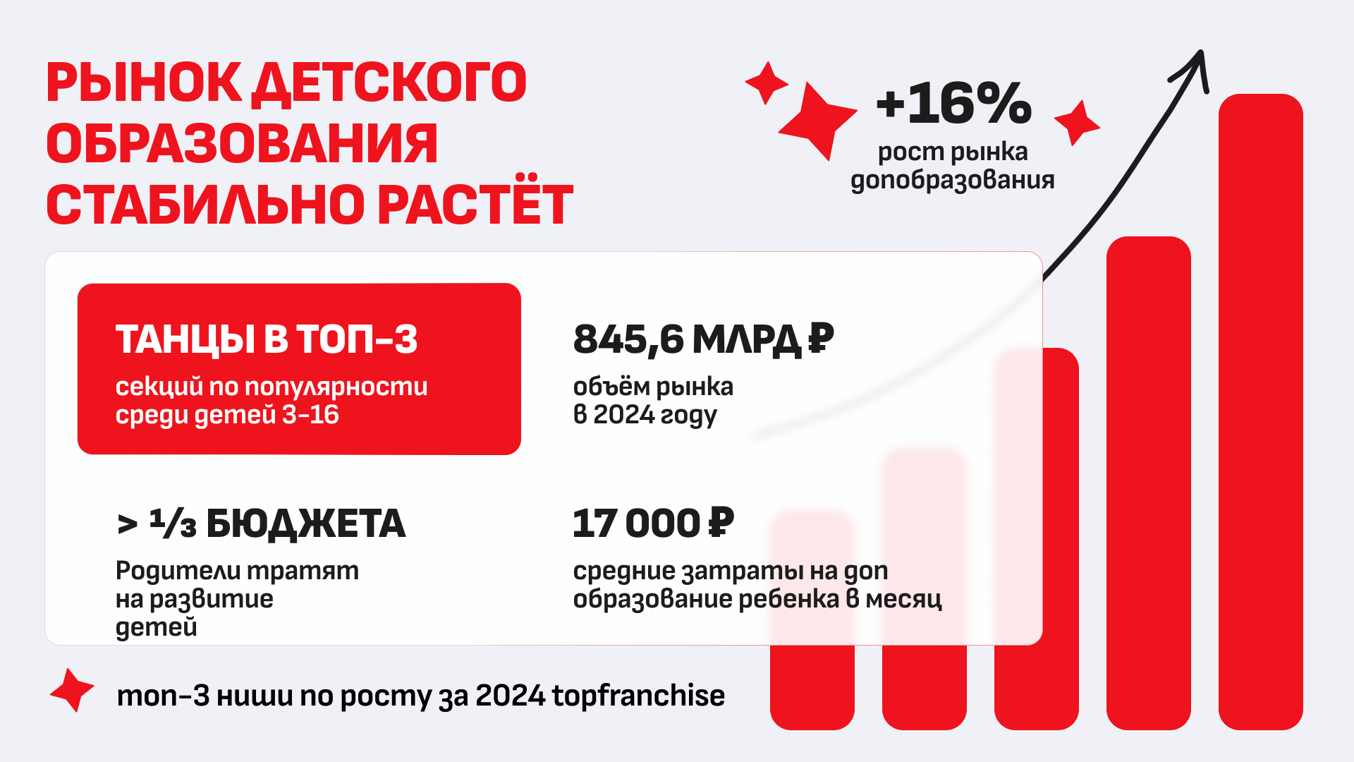 Франшиза детского доп. образования "Синергия"Стоимость400 000 ₽Инвестиции1 300 000 ₽Окупаемость9 мес.Доход2 000 000 ₽Рынок детского дополнительного образования растёт на 16% в год, и франшиза «Синергия» помогает занять в нём сильную позицию. Мы полностью берём на себя маркетинг, подбор персонала и лицензирование, а вы управляете школой. При среднем чеке 10 500 руб. и LTV ученика 9–12 месяцев партнёры выходят на доход до 1 500 000 руб. в месяц. Откройте школу танцев под известным брендом и начните зарабатывать с первого месяца.