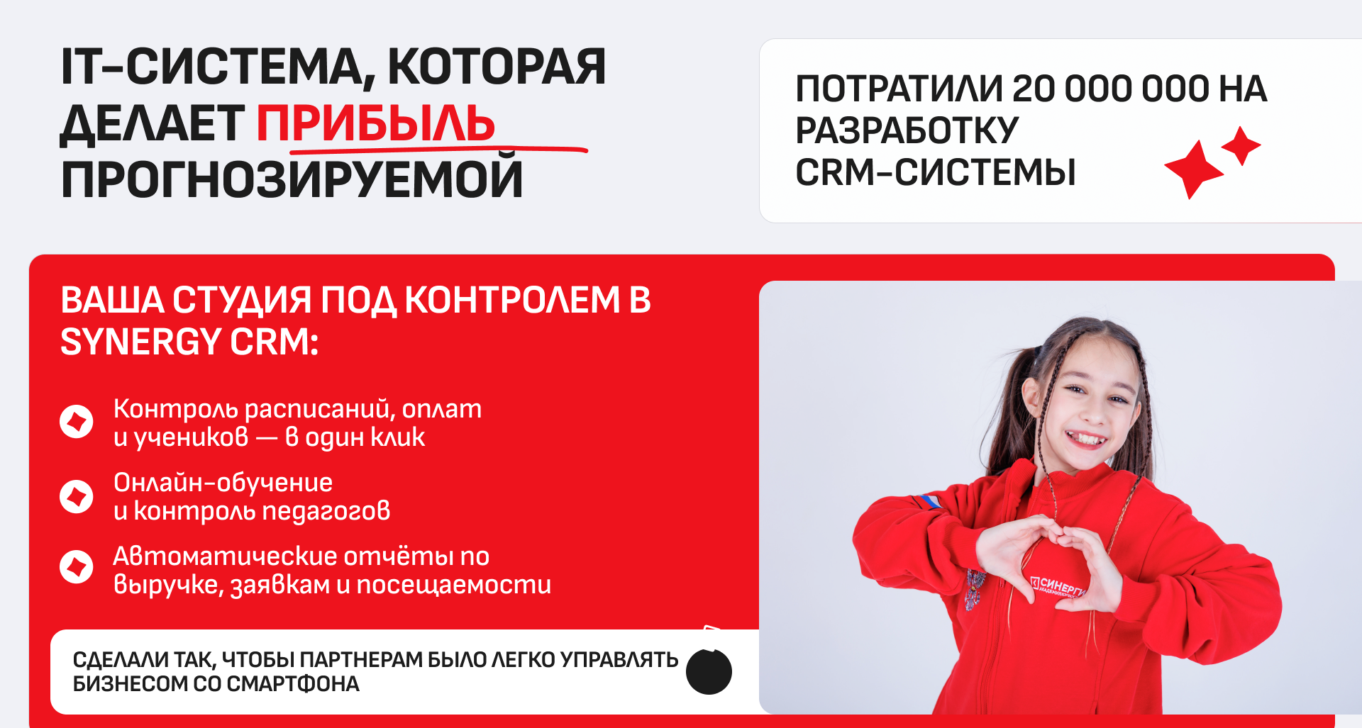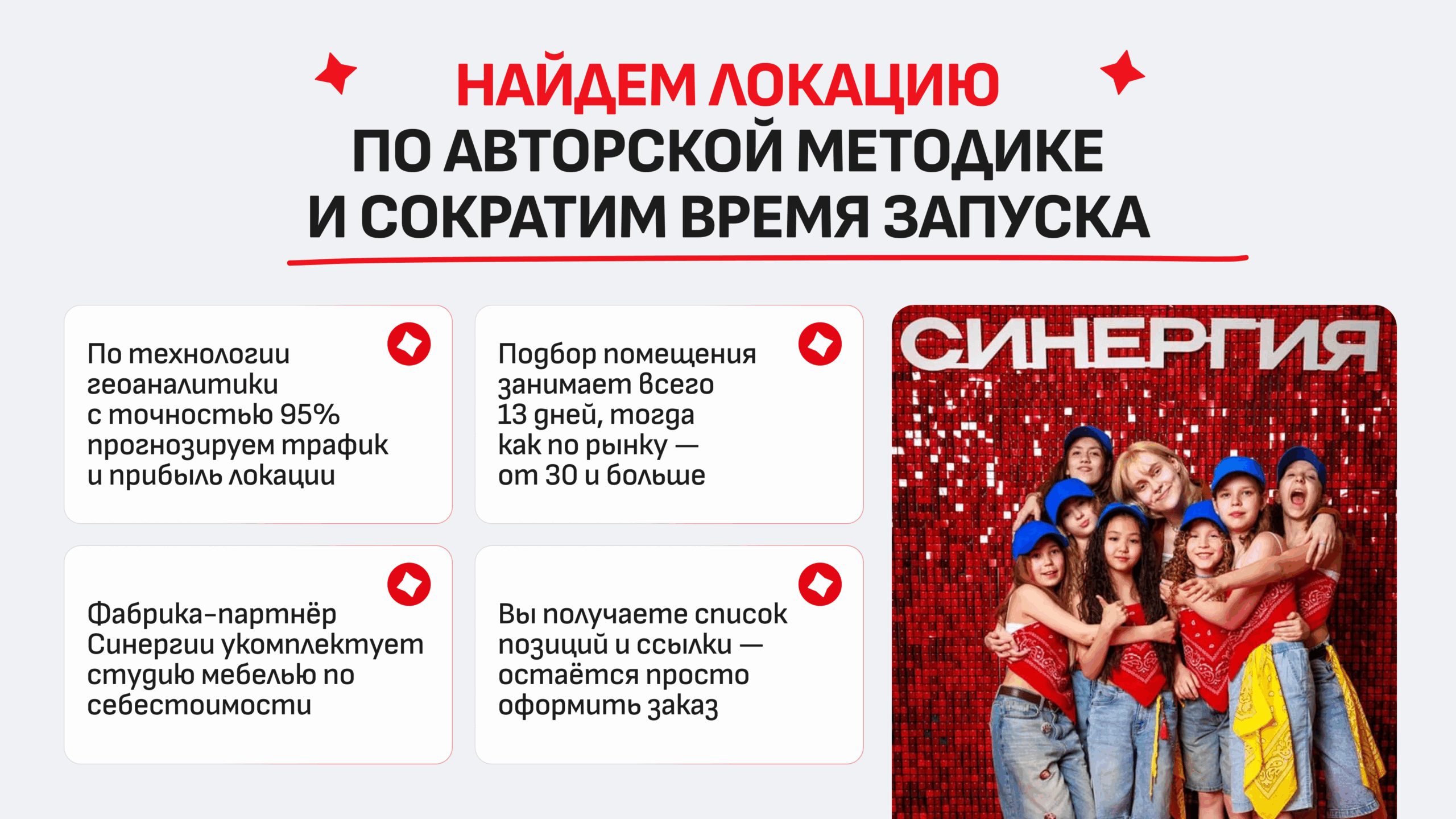 Школа музыки «Синергия»Стоимость750 000 ₽Инвестиции850 000 ₽Окупаемость8 мес.Доход300 000 ₽Наша академия является уникальным детским проектом холдинга СИНЕРГИЯ. Мы обеспечим вас первыми 20 учениками до открытия, передадим оцифрованные бизнес-процессы и простую схему управления, доступную даже новичкам в бизнесе. Мы гарантируем вам прибыль с первого месяца и рентабельность 43–60%. А благодаря команде маркетологов и поддержке на всех этапах запуска, мы сделаем запуск вашего бизнеса максимально лёгким и комфортным.