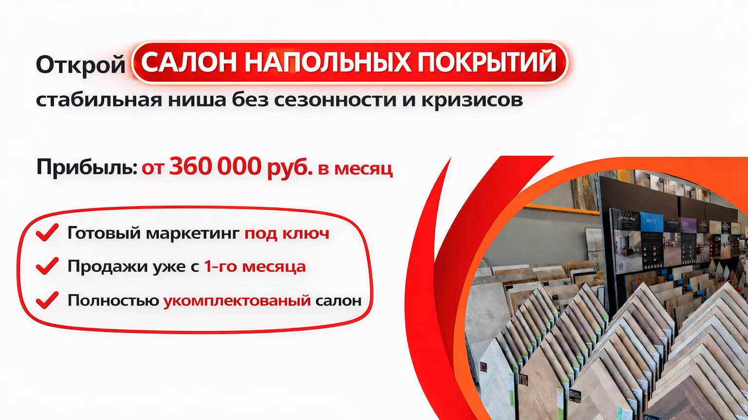 Салон напольных покрытийСтоимость500 000 ₽Инвестиции1 300 000 ₽Окупаемость6 мес.Доход360 000 ₽Франшиза салона напольных покрытий и дверей с быстрым стартом и вложениями под ключ от 1,2 млн. рублей. Мы обеспечиваем подготовку к открытию, маркетинговую поддержку и полное сопровождение бизнеса. Франчайзи получают прямые цены от производителей, персонального менеджера, обучение, поддержку 24/7 и пошаговый план запуска с учётом города. Рынок полов и дверей стабилен и востребован. Более 2-х лет успешно развиваем партнёрскую сеть. Предложение действует для городов с населением от 100 000 человек.