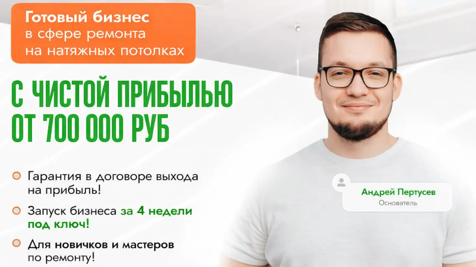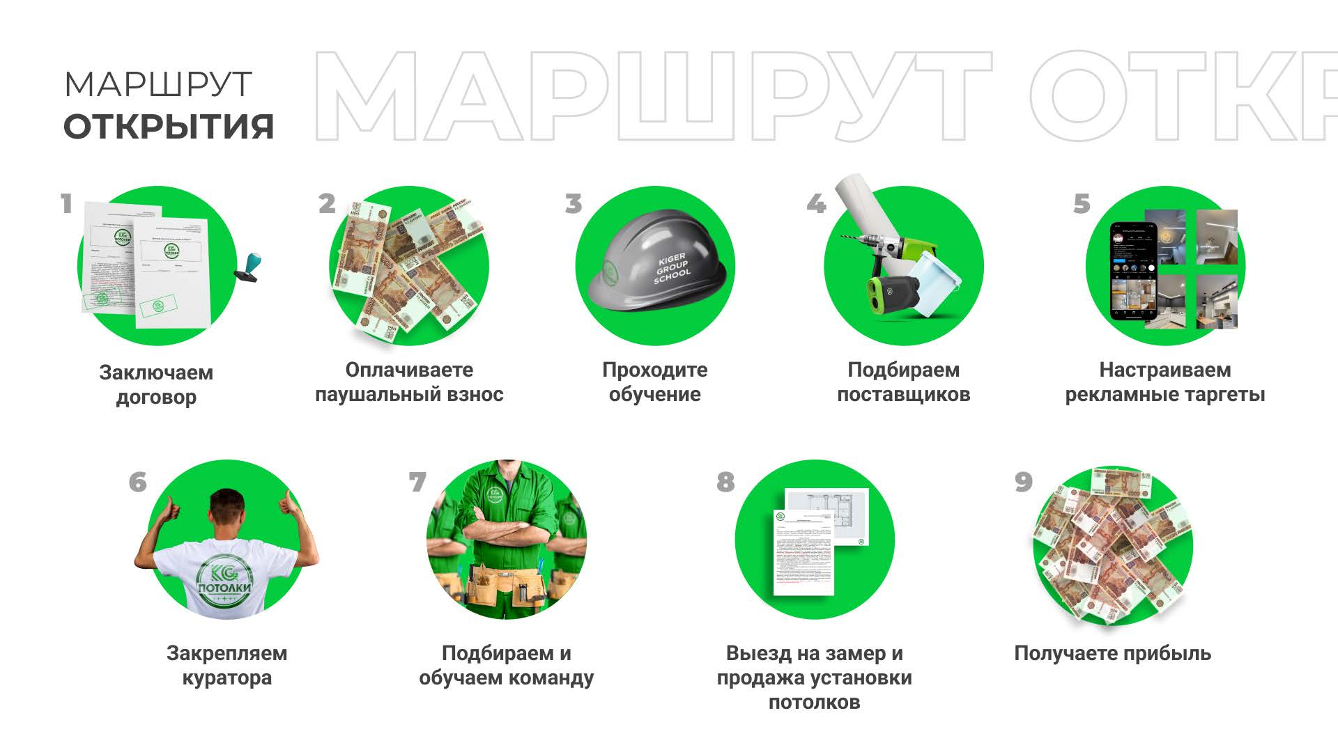 KIGERСтоимость500 000 ₽Инвестиции100 000 ₽Окупаемость2 мес.Доход700 000 ₽Запустив бизнес, вы будете зарабатывать до 700 000 рублей ежемесячно с маржой до 40%, устанавливая натяжные потолки. Гарантия прибыли прописана в договоре, а полное обучение и поддержка обеспечивают старт даже новичкам. В условиях роста строительного рынка наша специализированная ниша характеризуется высоким спросом и низкой конкуренцией, что создает благоприятные условия для вашего профессионального развития и финансового успеха