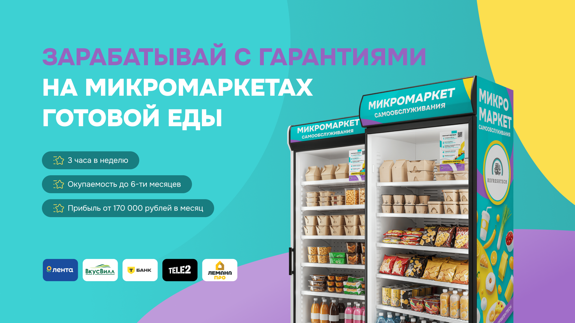 ReFreshСтоимость510 000 ₽Инвестиции70 000 ₽Окупаемость4 мес.Доход1 000 000 ₽Партнёры, выбравшие франшизу, получают доступ к быстрорастущему рынку быстрого питания. В нашей сети 48 микромаркетов самообслуживания с готовой едой и напитками. Наше сотрудничество с крупными брендами, такими как Яндекс, ВкусВилл и Сбербанк, обеспечивает высокую узнаваемость. Для старта предоставляется все необходимое оборудование, а запуск занимает всего 15 дней. Рынок микромаркетов растет на 12% ежегодно, благодаря спросу на удобные решения в местах высокой проходимости.