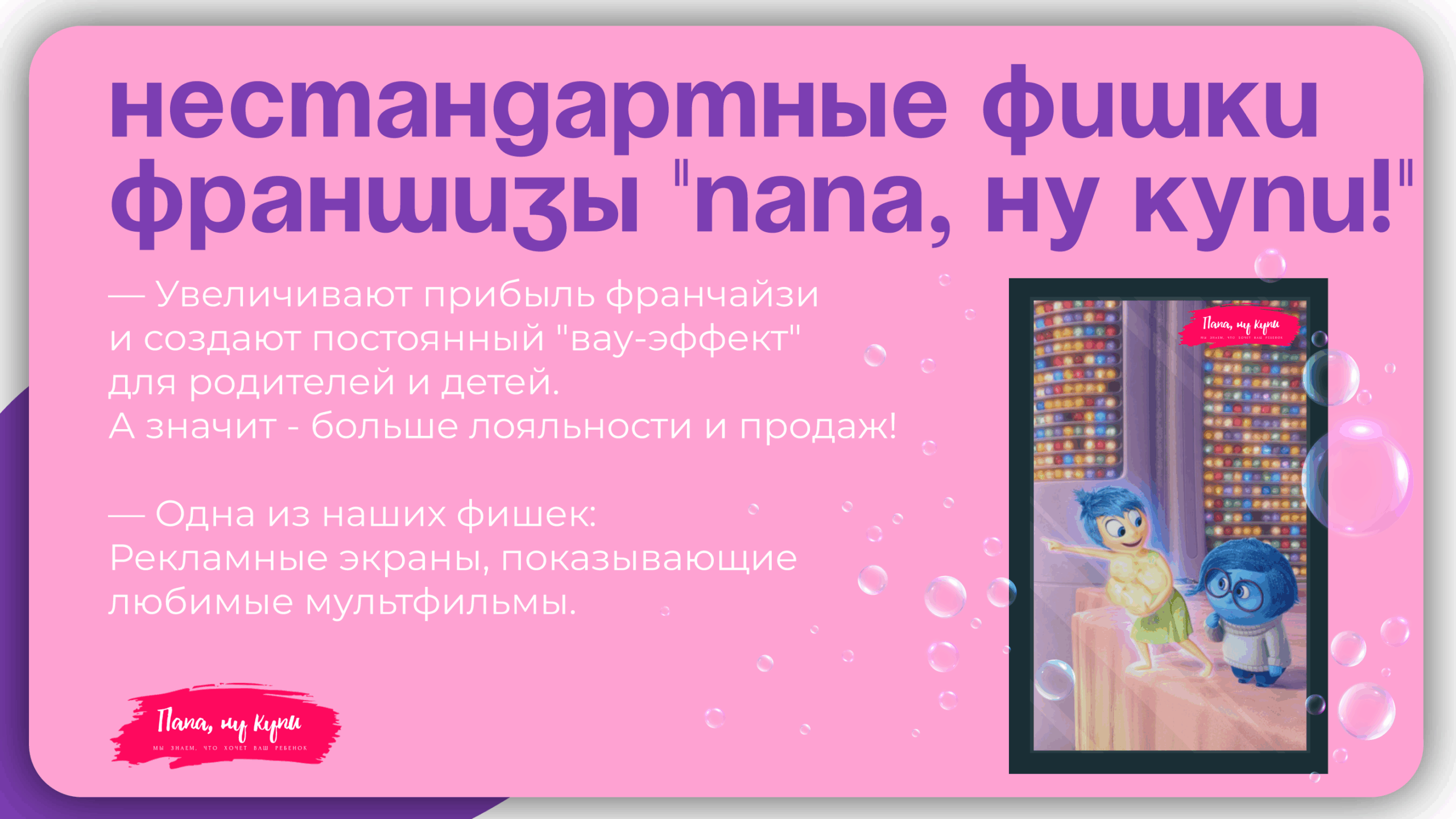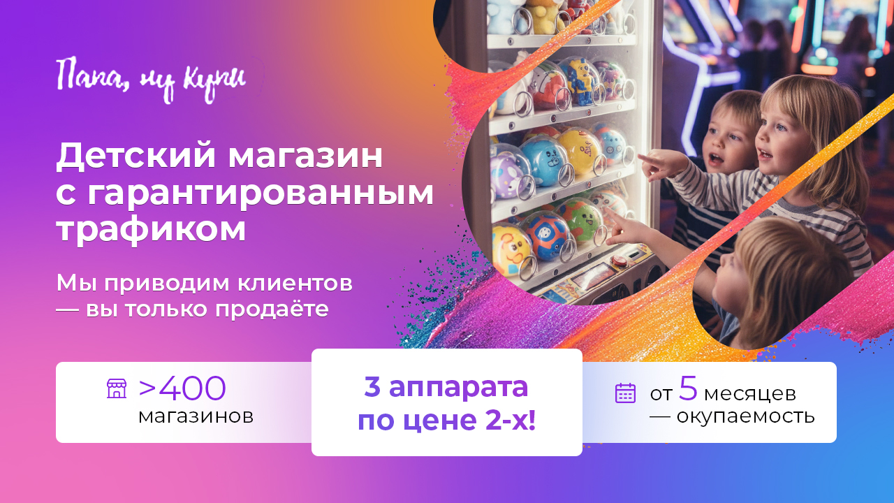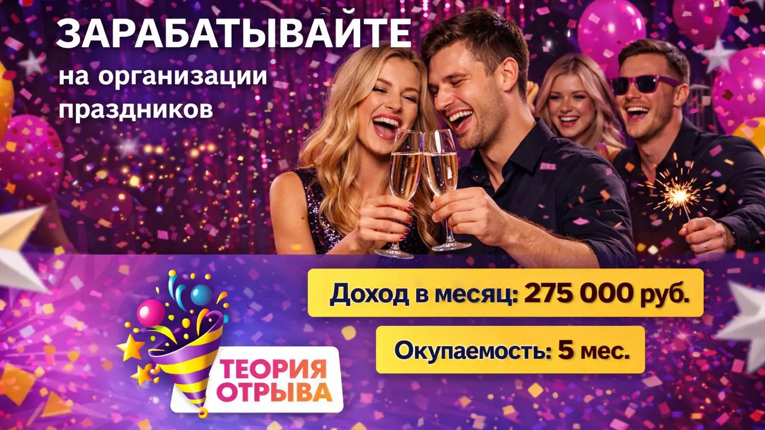 Теория ОтрываСтоимость580 000 ₽Инвестиции250 000 ₽Окупаемость5 мес.Доход275 000 ₽«Теория Отрыва» предлагает уникальную концепцию развлечений по мотивам популярных телешоу для детей и взрослых! Зарабатывайте до 170 000 рублей в месяц, организуя яркие мероприятия с высоким спросом на растущем рынке развлечений России. Мы обеспечиваем полный запуск, онлайн-обучение, поддержку экспертов и выездную команду для уверенного старта. Присоединяйтесь к «Теории Отрыва» и начните успешный бизнес уже сегодня!