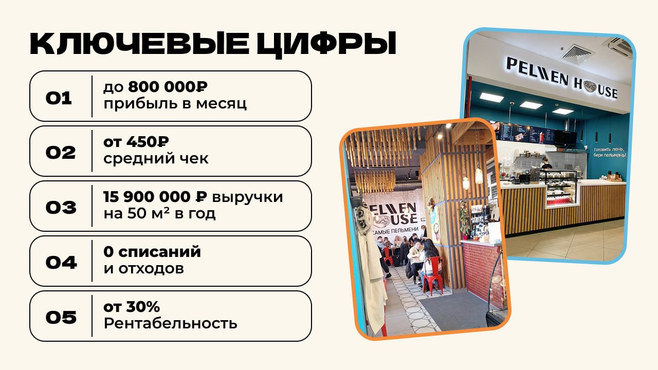 Pelmen houseСтоимость490 000 ₽Инвестиции800 000 ₽Окупаемость8 мес.Доход1 800 000 ₽95% рынка пельменных в России свободны. Pelmen House — франшиза №1: запуск за 4 недели, прибыль до 800 000 ₽ в месяц. Российский стрит-фуд: тонкое тесто, мясо, ручная лепка, авторские начинки. Без поваров, без кухни — 90% меню заморозка, хранится 180 суток, подача за 7 минут. Обучение персонала 2 часа. Pelmen House — победитель Гастрокарты России 2 года подряд. 5 форматов — киоск, фудтрак, фудкорт, кафе или вендинг 24/7. Пельмени в ТОП-3 блюд страны, а пельменных практически нет. Забирай свой город первым!