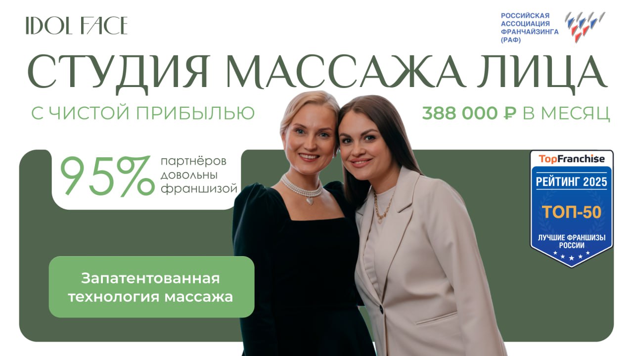 IDOL FACEСтоимость1 500 000 ₽Инвестиции3 000 000 ₽Окупаемость12 мес.Доход388 000 ₽IDOL FACE — франшиза студий лифтинга лица с запатентованной технологией, которая даёт заметный эффект уже за 1 час — без боли, реабилитации и рисков. Каждый 2-й клиент возвращается, обеспечивая стабильный поток и высокую повторяемость продаж. 95% партнёров довольны франшизой, а каждый пятый открывает второй салон. Партнёры зарабатывают до 4 000 000 - 8 000 000 рублей чистыми в год даже в городах от 100 000 жителей.