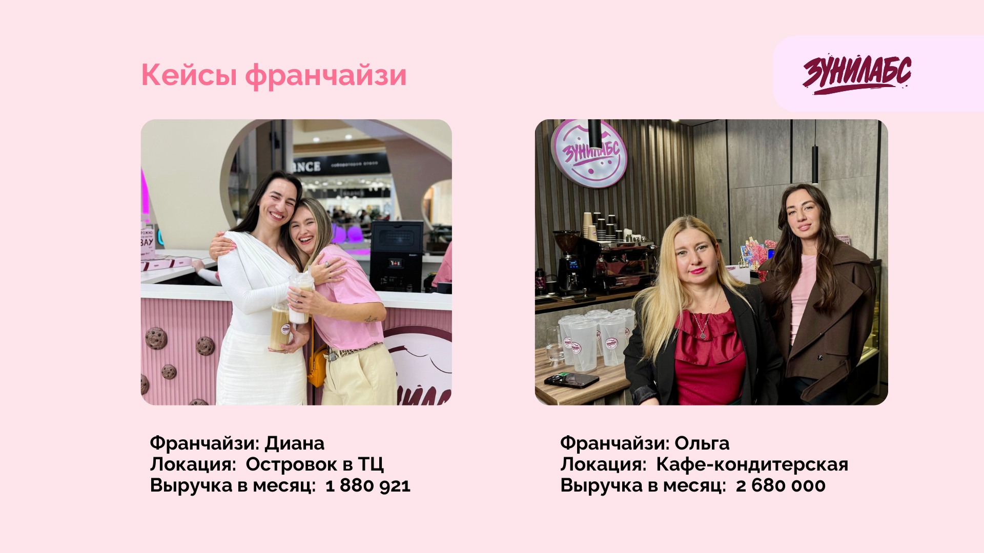 ЗунилабсСтоимость790 000 ₽Инвестиции350 000 ₽Окупаемость3 мес.Доход630 000 ₽Кофейня ЗУНИЛАБС — уютное место, которое привлекает гостей, особенно зумеров, своими фирменными двойными напитками — дабблами, знакомыми всему городу, и необычными печеньями — кукисами. Формат выстроен так, чтобы партнёр с первого дня видел, как растёт его прибыль. Доход — от 630 000 руб. в месяц. Бренд, стандарты, рецептуры и поддержка уже готовы. Вам остаётся открыть двери и встретить гостей!