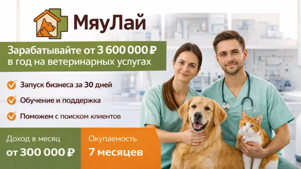 МяуЛайСтоимость300 000 ₽Инвестиции1 000 000 ₽Окупаемость7 мес.Доход300 000 ₽Станьте частью истории МяуЛай и зарабатывайте от 300 000 рублей ежемесячно на ветеринарных услугах! Нашим партнерам мы поможем запустить бизнес за 30 дней, проведем обучение для всей команды, поможем с поиском помещения, обеспечим клиентами, благодаря грамотно построенной рекламной кампании и дадим поставщиков оборудования. Наши клиники предоставляют лечение, стационар, гостиницу для питомцев, груминг и другие услуги. Готовая бизнес-модель и профессиональная поддержка позволяют партнёрам быстро выйти на стабильную прибыль.