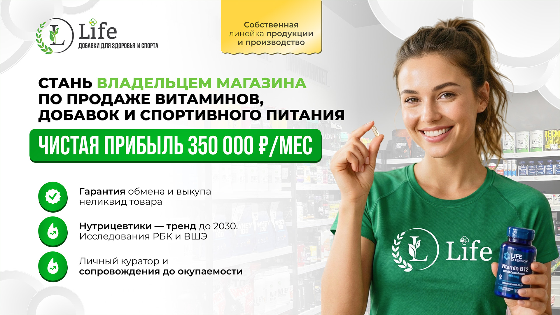 LifeСтоимость500 000 ₽Инвестиции2 000 000 ₽Окупаемость12 мес.Доход350 000 ₽Life — франшиза магазина нутрицевтики в ТЦ: витамины, БАДы, спортпит (до 15 000 SKU) + собственная ТМ Dr.Life и производство в Смоленске. Нутрицевтики — тренд до 2030. Запуск за 60 дней: подберём до 10 локаций, наймём и обучим команду, ведём до прибыли. 80% клиентов — постоянники. Наценка до 150%, выручка до 2 млн ₽/мес. Гарантия обмена/выкупа неликвида, поддержка 24/7. Инвестиции от 2,5 млн ₽, прибыль 150–500 тыс ₽/мес, окупаемость 8–12 мес.