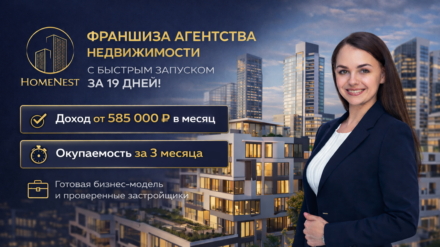 HOMENESTСтоимость360 000 ₽Инвестиции175 000 ₽Окупаемость2 мес.Доход580 000 ₽HOMENEST — это франшиза онлайн-агентства недвижимости полного цикла для тех, кто хочет стабильно зарабатывать на сделках по всей России без открытия офлайн-офиса. Вы получаете готовый бизнес под ключ: обучение, маркетинг, юридическое сопровождение и доступ к базе объектов. Модель объединяет оценку, сопровождение и сделки, обеспечивая высокий доход с каждой операции и окупаемость уже от 2 месяцев. Запустите прибыльный бизнес в недвижимости при поддержке федеральной сети.
