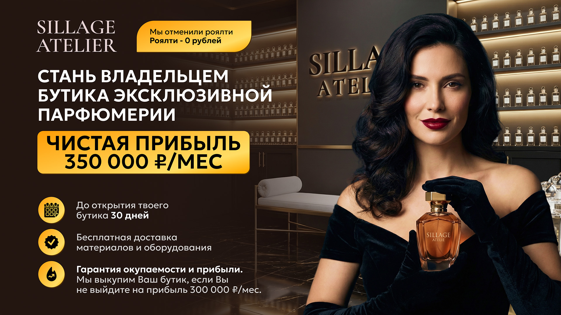 Sillage AtelierСтоимость500 000 ₽Инвестиции3 000 000 ₽Окупаемость8 мес.Доход350 000 ₽Франшиза бутика парфюмерии в ТЦ: 300+ ароматов-хитов, масла из Европы с сертификатами. 70% ассортимента — эксклюзив, 89% гостей возвращаются за «своим» ароматом — продажи круглый год без списаний. Всего 10 чеков в день = прибыль 350 000 ₽/мес. Запуск за 30 дней: подберём локацию, выбьем аренду, обучим и ведём до результата. Роялти 0. Окупаемость ~8 мес. Гарантия: если за год не выйдете на 300 000 ₽ чистыми — выкупим товар и оборудование.