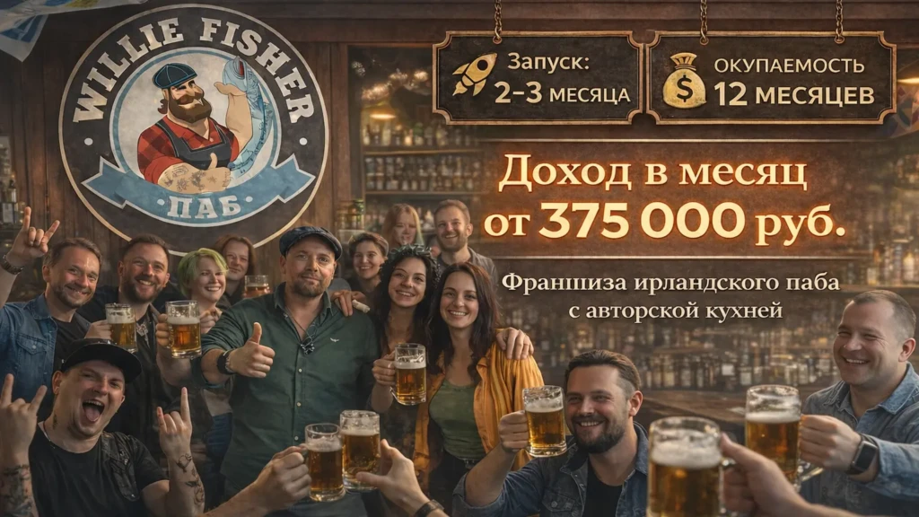 Willie FisherСтоимость700 000 ₽Инвестиции4 000 000 ₽Окупаемость12 мес.Доход375 000 ₽Willie Fisher — атмосферный ирландский ПАБ с продуманной концепцией, авторской кухней и культурой отдыха. Это уникальный ПАБ, с характером и постоянной аудиторией. Партнёр получает полное сопровождение от запуска до операционного управления. Старт за 2–3 месяца, маржинальность до 72%, эффективность до 34%. Оставьте заявку и получите персональные условия открытия Willie Fisher ПАБ в своём городе (подходит для локаций с населением от 35 тыс.)!