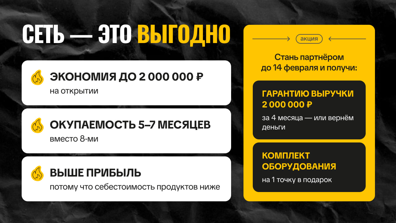 ЧебурекМи 4 точкиСтоимость1 000 000 ₽Инвестиции3 500 000 ₽Окупаемость5 мес.Доход830 000 ₽Сеть из 4 точек ЧебурекМи с окупаемостью 5–7 месяцев — уникальный результат при инвестициях 4 500 000 рублей. Прибыль 830 000 ежемесячно + экономия до 2 000 000 р на старте. Потому что в основе — простая модель: 2 человека на точку, массовый продукт с наценкой до 400% и стабильный спрос даже в кризис. 370+ точек в 6 странах подтверждают — формат работает. Зайди в пик сезона стритфуда с готовым проверенным решением! Оставляй заявку👇