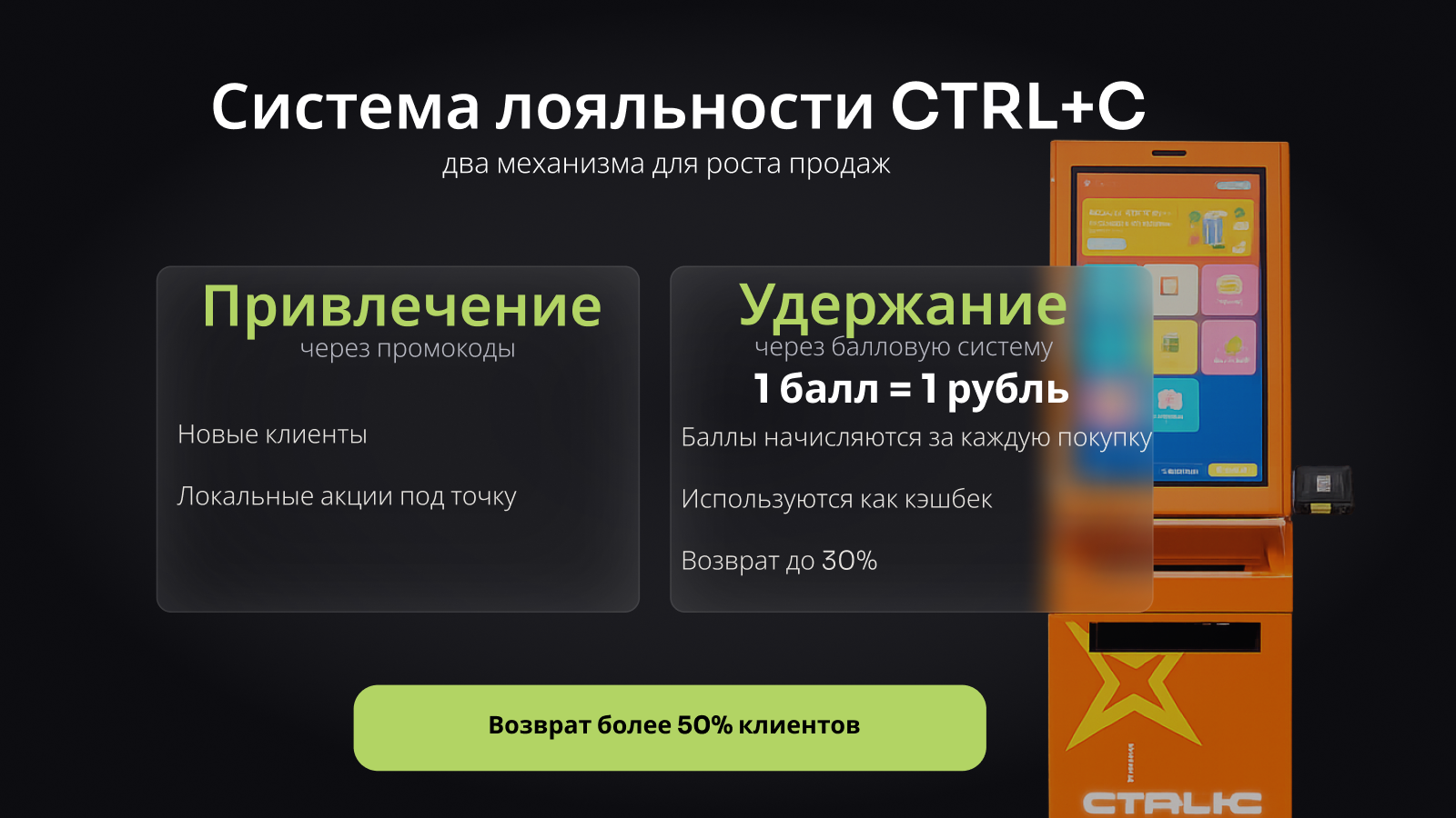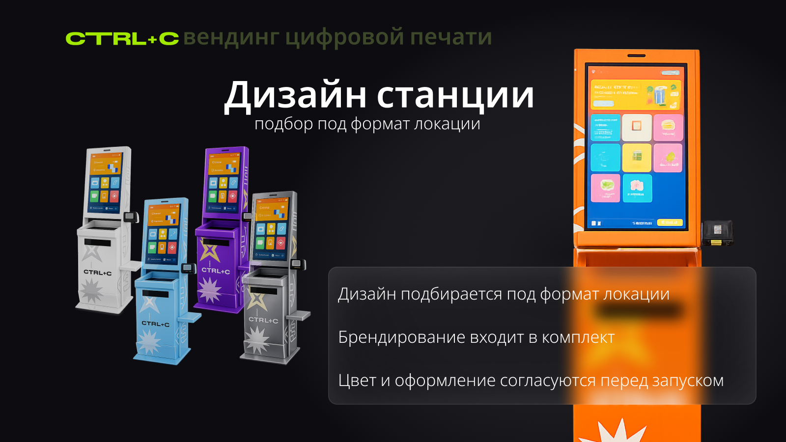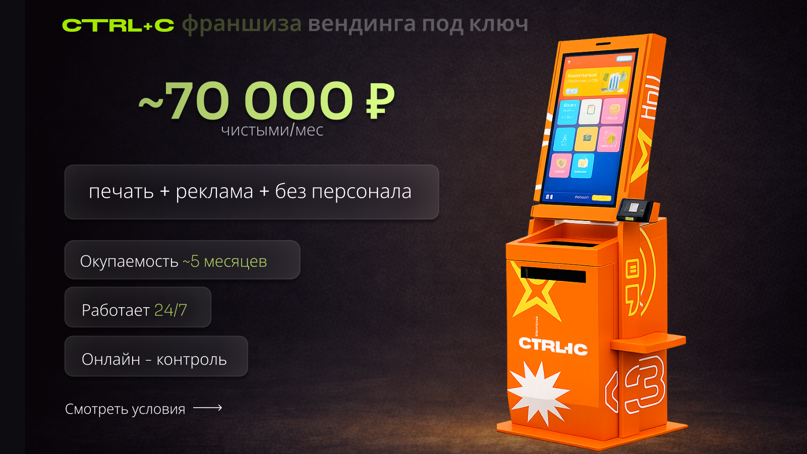 CTRL + CСтоимость175 000 ₽Инвестиции175 000 ₽Окупаемость5 мес.Доход70 000 ₽CTRL+C — вендинг цифровой печати и копирования 24/7 с двумя видами дохода. Получай ежемесячную от 70 000 р в востребованном и быстрорастущем направлении. Стабильный бизнес без сотрудников и отдельного помещения: клиент сам загружает файл, оплачивает и сразу получает распечатку. Два источника дохода: печать и реклама на станции от локальных бизнесов. От нас — обучение, запуск, техническое обслуживание станции и рекламные материалы. Подходит для старта и масштабирования в сеть из 2–3 точек.