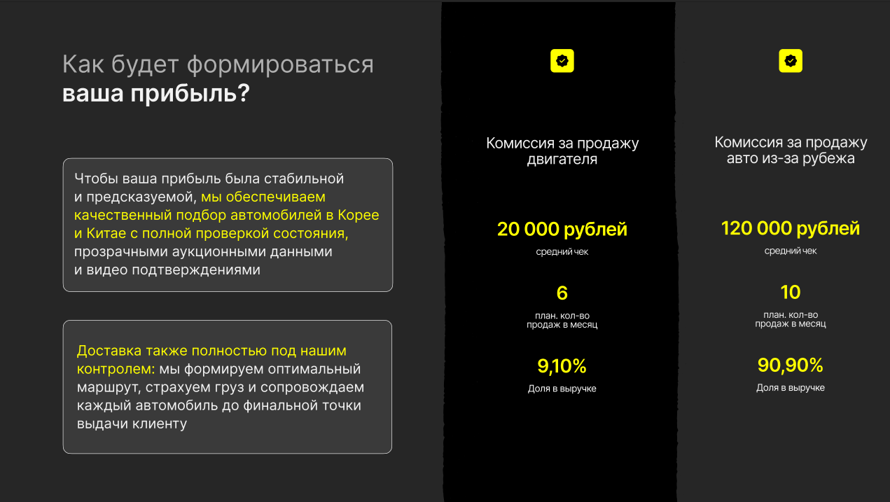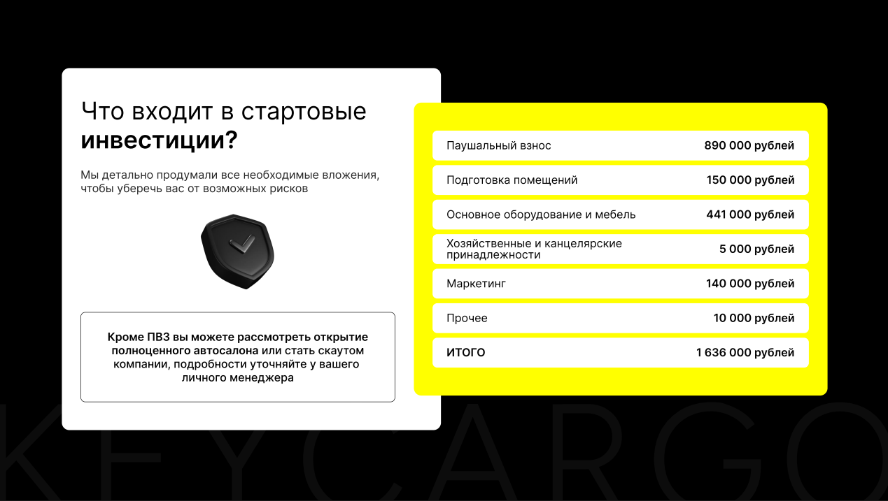 Tent GuardСтоимость690 000 ₽Инвестиции700 000 ₽Окупаемость4 мес.Доход500 000 ₽Tent Guard — франшиза по производству тентов и изделий из ПВХ. С 2020 года мы выпускаем тенты для фур/газелей, мягкие окна, глэмпинги, татами, ковры, пологи и т.д. Франшиза уже объединяет 20+ партнёров в России, Белоруссии и Казахстане и имеет контракты с крупными клиентами: Делко, Дел Транс, Деловые Линии, ПЭК, КИТ и др. Окупаемость вложенных инвестиций — 4 месяца. Входите в проверенный рынок с готовой бизнес-моделью и стабильными заказами.
